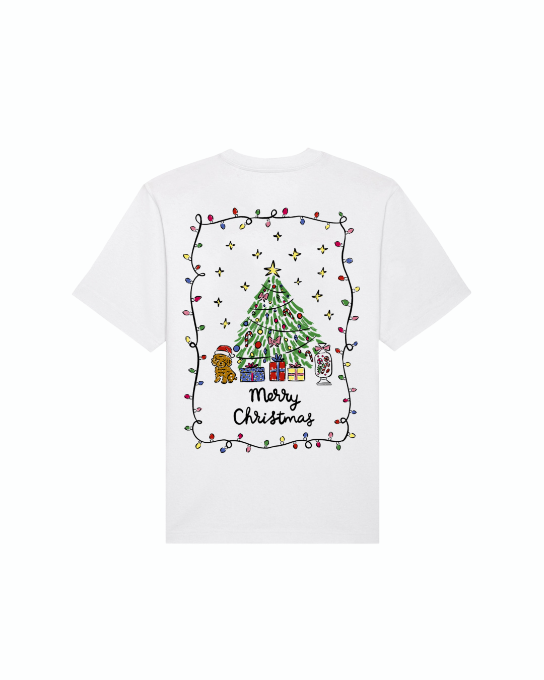 Each T-shirt features a front and back Christmas print, printed with water-based, non-toxic inks.