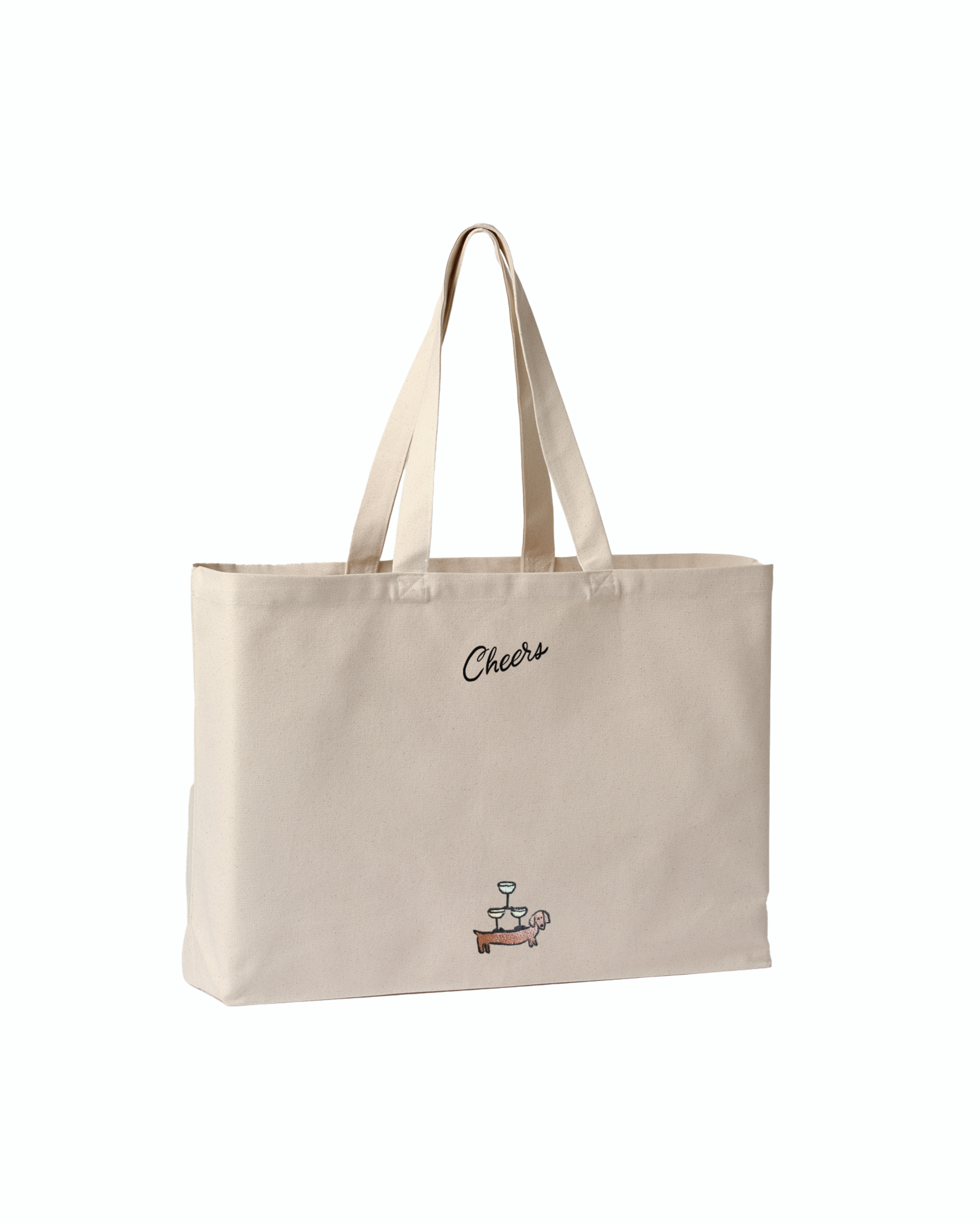 Our Christmas Edit Large Bow Bag is crafted from 100% recycled heavyweight cotton canvas for a strong, premium feel. A bold embroidered bow takes centre stage on the front, while playful dog, champagne, and “Cheers” embroidery detail the reverse. Practical yet beautifully made, it’s a timeless piece designed to be carried all year round.